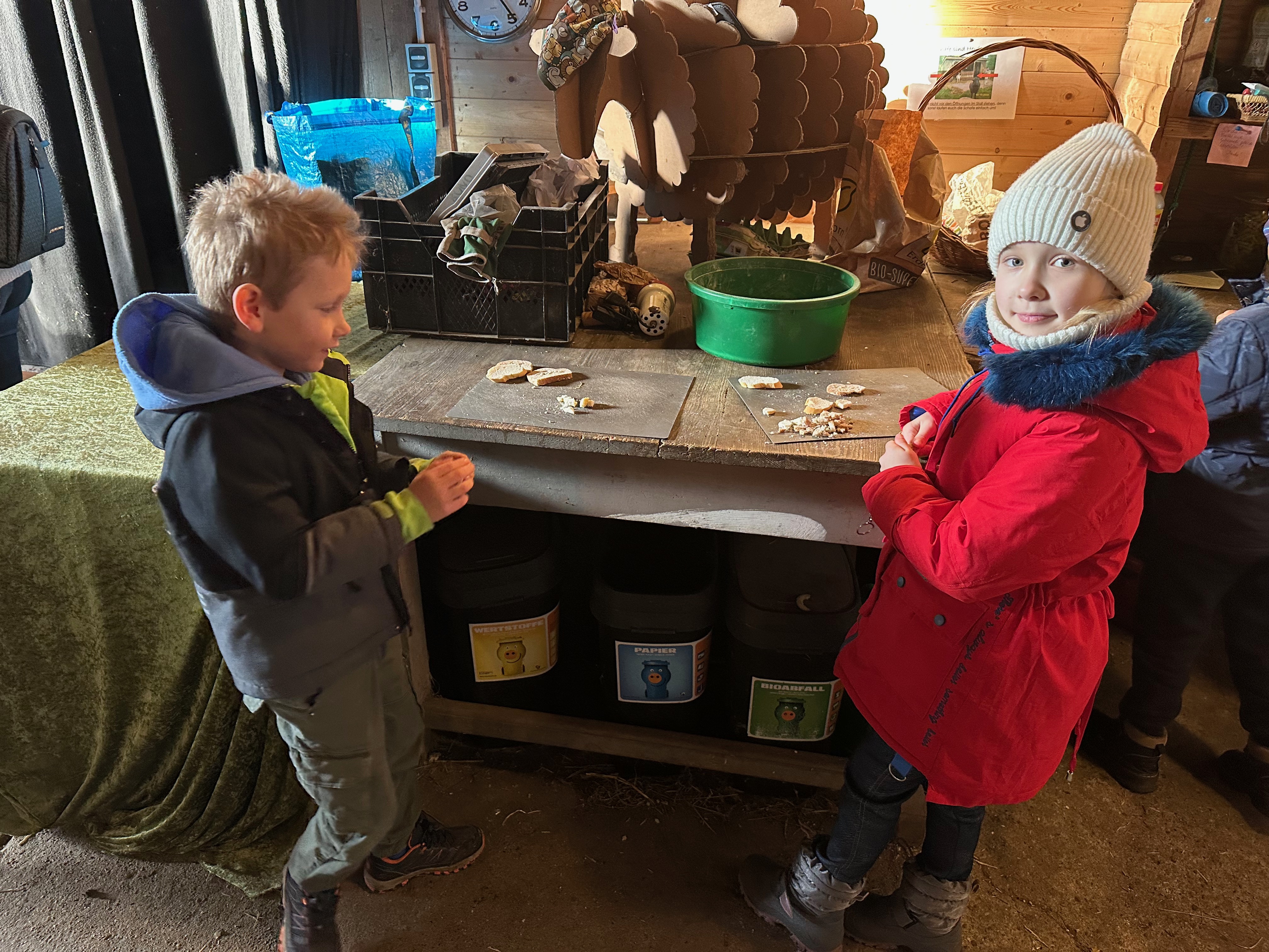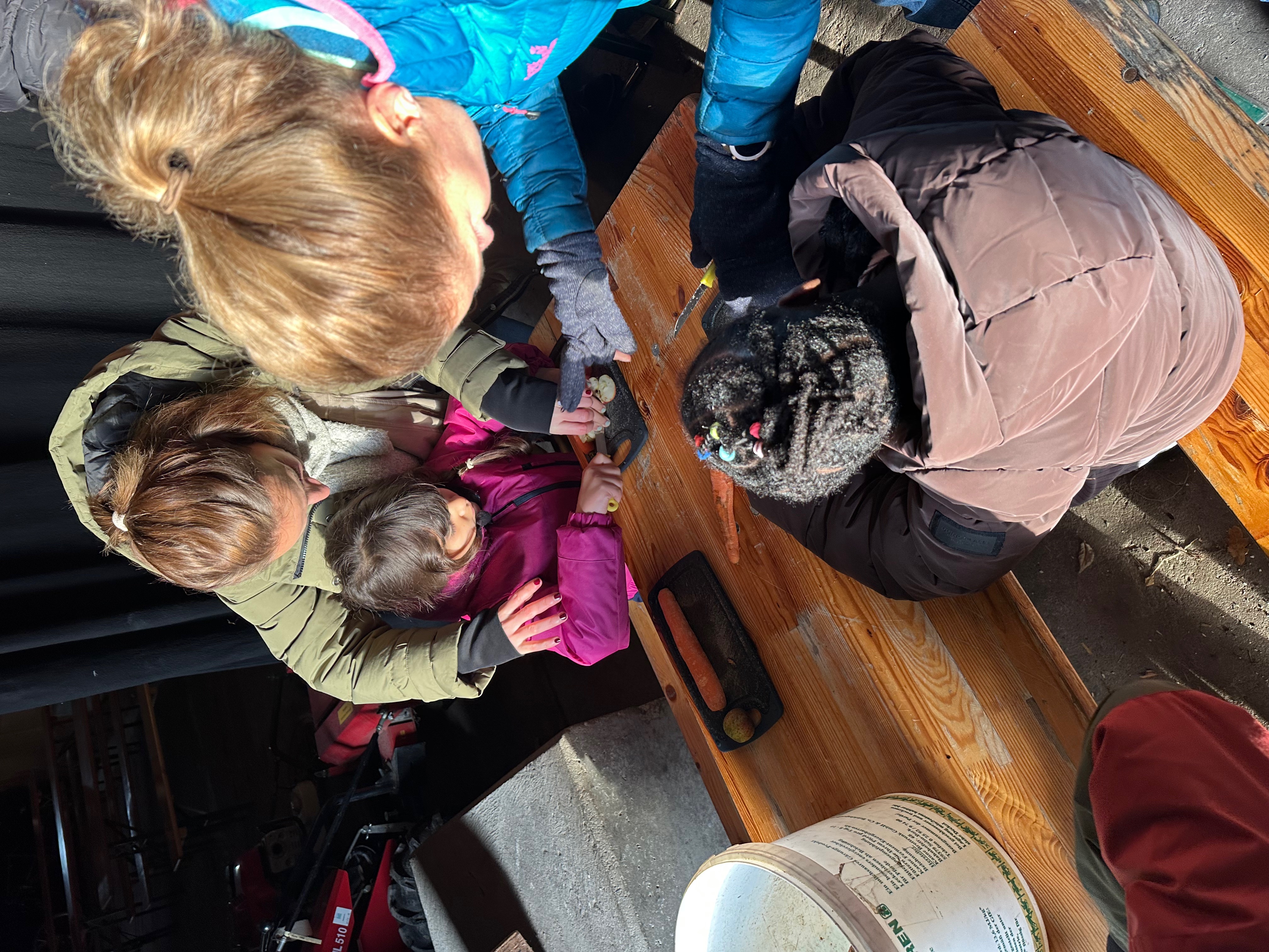 Am Morgen ging’s direkt zu den Schafen. Heu holen, Äpfel und Möhren klein schneiden, Wasser auffüllen, Brot vorbereiten – das volle Programm. Danach wurde am Zaun gefüttert, und die Kinder hatten sichtlich Spaß dabei.